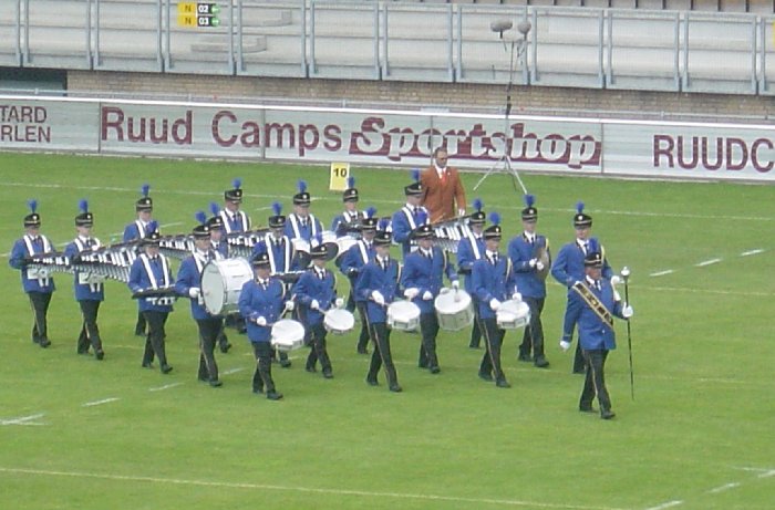 Om 12 uur was de start van de marswedstrijden en Vrij en blij stond voor 13.10 uur gepland. Door enige verschuivingen was de Malletband al om 12.50 aan de beurt, scheelde weer een poosje wachten in het toch wel erg warme uniform. Als je als vereniging voor het eerst het stadion in marcheert gieren de zenuwen door het lijf. Zodra je bij de startstreep staat kun je nog maar één ding doen; je uiterste best. Dat deden de leden van Vrij en Blij zeer zeker. Onder leiding van tamboermaître Henk Jans werd het verplichte stratenparcours gelopen. De marsen "Yorktown Blues" en "Break Out" van Jan Schipper werden naar beste kunnen gespeeld. Hier was ook hard op gerepeteerd onder leiding van instructeur Rob van Plateringen. Het marcheren in zo'n groot stadion en het continue applaus van het publiek gaven een enorme kick. De extra luide aanmoedigingen van de eigen supporters waren goed te horen voor de malletbandleden. De supportes zaten allemaal bij elkaar en hadden bijna allemaal een blauw t'shirt van de vereniging aan zodat ze goed te herkennen waren. Na afloop van het optreden volgde de ontlading. Iedereen had zich voor de volle 100 procent ingezet en er viel een hele druk van alle schouders. De leden waren het er over eens dat ze een goede prestatie hadden neergezet en ze niet beter konden. Ook Rob van Plateringen was tevreden over het optreden. Daarna kon men nog naar vele verenigingen uit andere landen kijken.